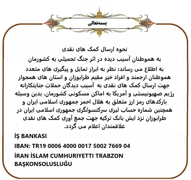 ارسال کمک های نقدی به هموطنان آسیب دیده از جنگ تحمیلی از طریق بارکدهای اختصاصی (رمز ارز) هلال احمر جمهوری اسلامی ایران و یا حساب لیری اختصاص یافته از سوی سرکنسولگری ج.ا.ایران در طرابوزان میسر می‌باشد.